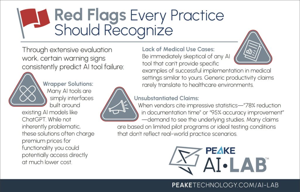 Most practices rely heavily on vendor materials and sales demonstrations when evaluating AI tools. This approach is fundamentally flawed. Vendors naturally present their products in the best possible light, often glossing over integration challenges, workflow disruptions, and real-world limitations.