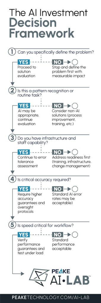 - Can we tolerate AI errors? All AI systems have failure rates. For tasks where accuracy is critical, understand the error rate and have mitigation strategies in place.